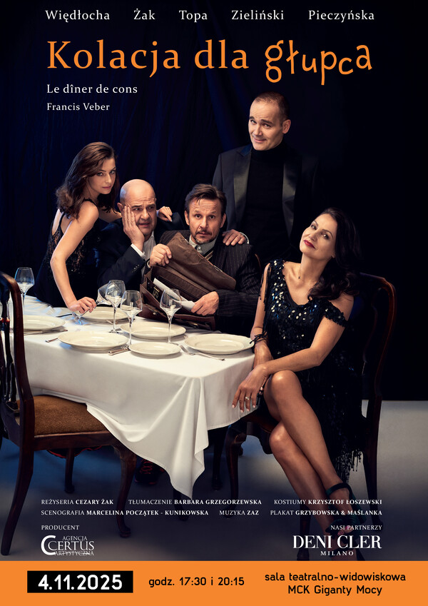 Miejskie Centrum Kultury w Bełchatowie zaprasza na spektakl pt. „Kolacja dla głupca”, który odbędzie się 4 listopada 2025 r. o godzinie 17:30 oraz 20:15 w sali teatralno – widowiskowej MCK Giganty Mocy.