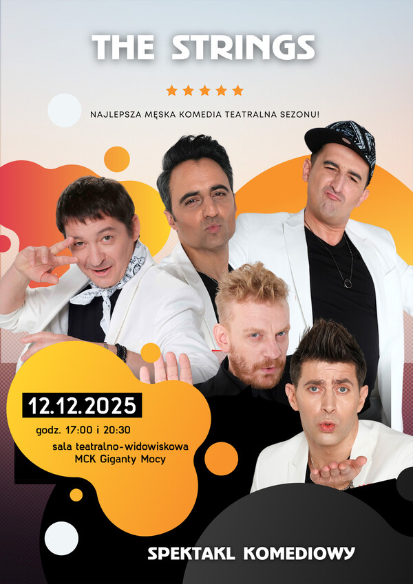 Miejskie Centrum Kultury w Bełchatowie zaprasza na spektakl komediowy pt. „The Strings”, który odbędzie się 12 grudnia 2025 r. o godzinie 17:00 oraz 20:30 w sali teatralno – widowiskowej MCK Giganty Mocy.