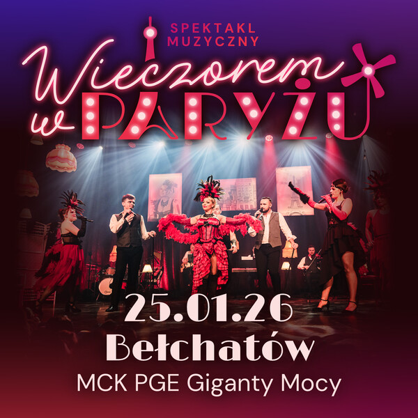 Miejskie Centrum Kultury w Bełchatowie zaprasza na spektakl muzyczny pt. „Wieczorem w Paryżu”, który odbędzie się 25 stycznia 2026 r. o godzinie 15:00 oraz 18:00 w sali teatralno – widowiskowej MCK PGE Giganty Mocy.