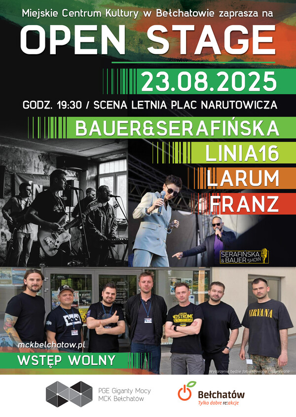 Miejskie Centrum Kultury w Bełchatowie zaprasza na koncert z cyklu Open Stage, który odbędzie się 23 sierpnia o godzinie 19:30 na scenie plenerowej MCK.