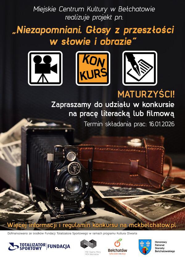 Miejskie Centrum Kultury w Bełchatowie rozpoczyna realizację projektu pn. „Niezapomniani. Głosy z przeszłości w słowie i obrazie”, którego celem jest zachowanie pamięci o świadkach II Wojny Światowej poprzez twórczość młodzieży. W ramach zadania ogłaszamy powiatowy konkurs pisarski oraz filmowy, skierowany do uczniów klas maturalnych ze szkół ponadpodstawowych z terenu Powiatu Bełchatowskiego. Zadaniem uczestników będzie zebranie, udokumentowanie i twórcze opracowanie wspomnień osób starszego pokolenia – świadków wydarzeń z czasów wojny. Mogą to być relacje dotyczące życia codziennego, działalności konspiracyjnej, pomocy ludności cywilnej, przesiedleń, ukrywania się czy dramatycznych losów rodzin. Prace konkursowe można składać w dwóch kategoriach: literackiej (biografia) lub filmowej (amatorski film dokumentalny). Nabór prac konkursowych potrwa do 16 stycznia 2026 r.