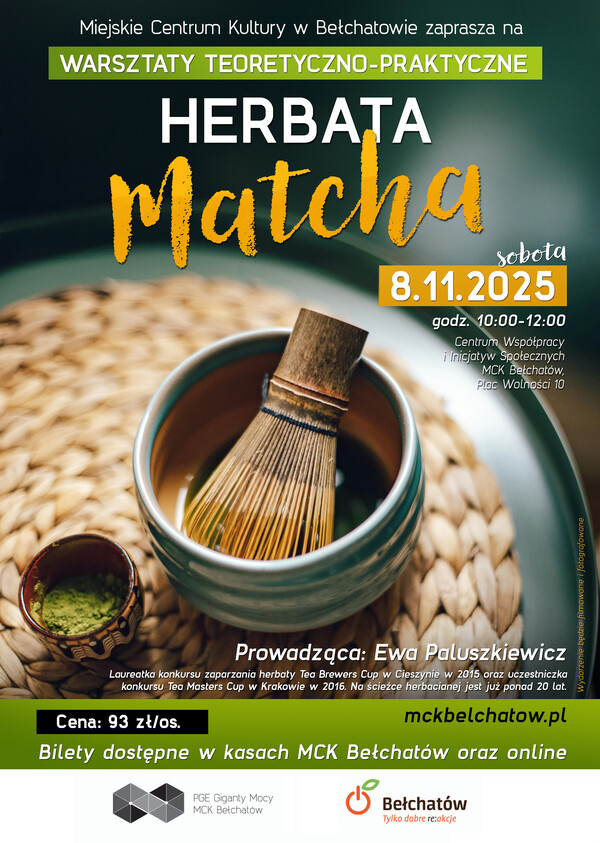 Miejskie Centrum Kultury w Bełchatowie zaprasza na warsztaty teoretyczno-praktyczne „Herbata Matcha”, które odbędą się 8 listopada br. o godzinie 10:00 w CWiIS Plac Wolności 10.