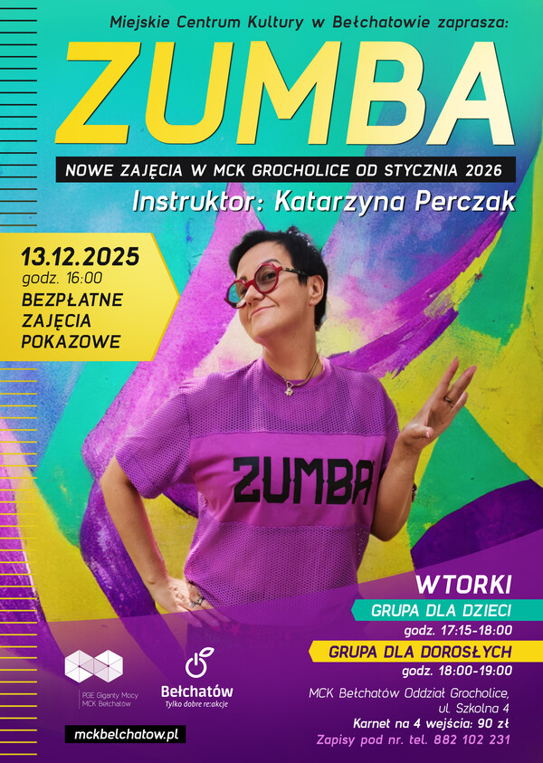 Miejskie Centrum Kultury zaprasza na zajęcia pokazowe z zumby, które odbędą się 13 grudnia br. o godz. 16:00 w MCK Grocholice przy ulicy Szkolnej 4.