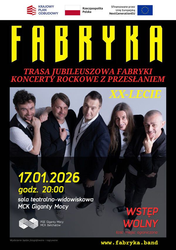 Miejskie Centrum Kultury w Bełchatowie zaprasza na Jubileuszowy koncert zespołu Fabryka, który odbędzie się 17 stycznia 2026 r. o godzinie 20:00 w sali koncertowej MCK.