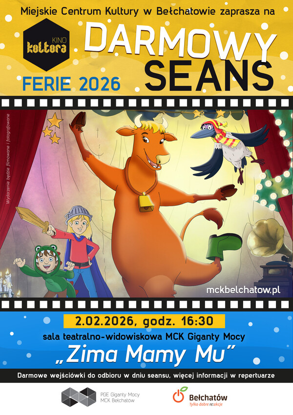 Miejskie Centrum Kultury w Bełchatowie zaprasza dzieci i ich opiekunów na darmowy seans animowany „Zima Mamy Mu”, który odbędzie się 2 lutego 2026 roku o godzinie 16:30 w sali teatralno-widowiskowej MCK Giganty Mocy.