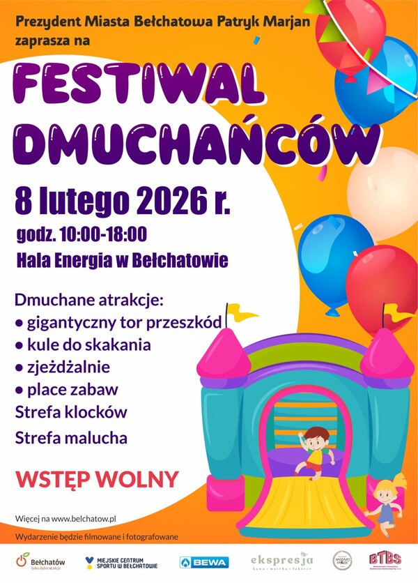 Najmłodszych mieszkańców Bełchatowa – a także tych trochę starszych – zapraszamy na pełen atrakcji Festiwal Dmuchańców. Wstęp jest całkowicie bezpłatny, a dobrej zabawy na pewno nie zabraknie. W Hali Energia pojawią się dmuchane tory przeszkód, zjeżdżalnie, kule do skakania, a także strefa klocków i malucha. Na uczestników czekać będą również animatorzy, którzy poprowadzą konkursy i wspólne zabawy.